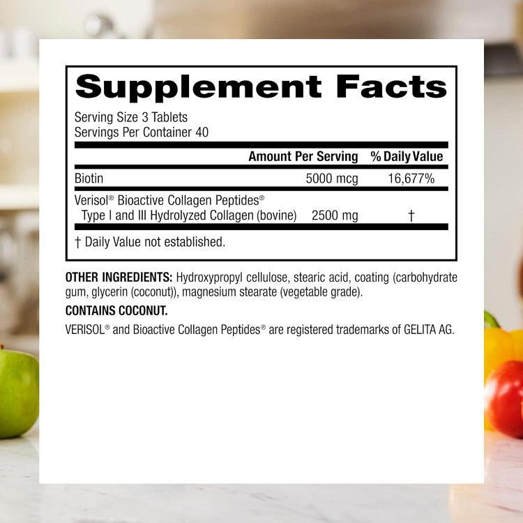 Nature’s Bounty به شکل جویدنی با طعم میوه عرضه میشود و حاوی بیوتین بالاست، اما میزان کلاژن آن کمتر از Collagen30® است.