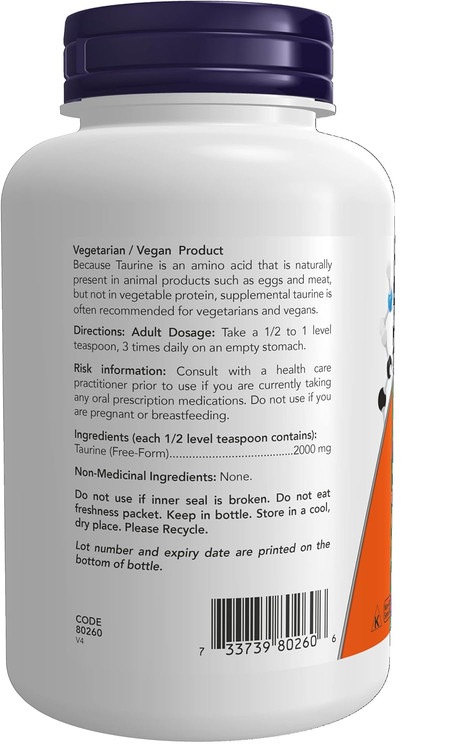 NOW Foods Taurine Pure Powder یک مکمل پودری خالص از تائورین است، اسید آمینهای که در بسیاری از عملکردهای حیاتی بدن نقش دارد. این محصول با فرم پودری خود، انتخاب مناسبی برای افرادی است که به دنبال تنظیم دقیق دوز مصرفی یا افزودن این اسید آمینه به رژیم غذایی یا نوشیدنیهای خود هستند.