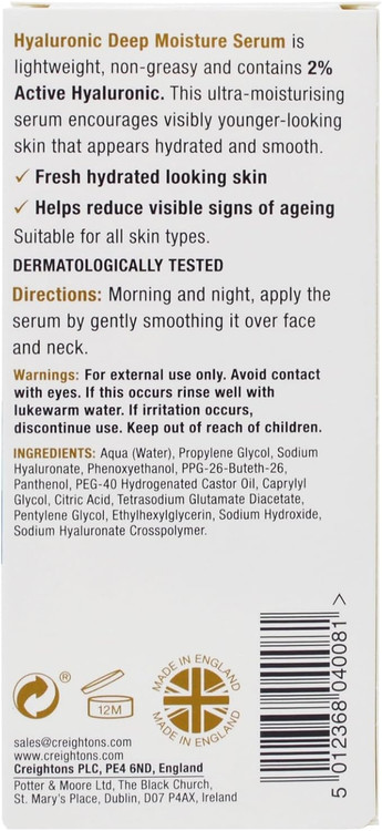 این سرم آبرسان با ترشح هیالورونیک به پوست شما ظاهری جوان و صاف میبخشد. ضمن اینکه این سرم صورت به عنوان آبرسان عمل میکند می تواند به خاصیت ارتجاعی بودن پوست کمک کند و علایم بارز پیری را بطور کاملاً چشمگیری کاهش دهد. اسید هیالورونیک موجود در این سرم میتواند تمام خطوط عمیق صورت مانند خط خنده، خط اخم و خطوط پنجه کلاغی دور چشم را کاملاً از بین ببرد و همچنین انعطاف پذیری پوست شما را افزایش دهد که در نهایت موجب کاهش نشانههای پیری پوست میشود.