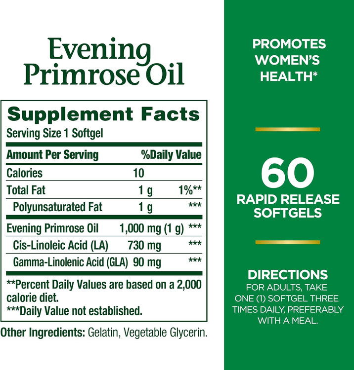 Nature’s Bounty Evening Primrose Oil یک مکمل طبیعی است که از روغن گیاه گل شبدرخت (Evening Primrose) استخراج شده است. این روغن حاوی گاما-لینولنیک اسید (GLA) است که یکی از اسیدهای چرب ضروری برای بدن به شمار میرود و به ویژه برای سلامت زنان بسیار مفید است. این محصول در قالب 60 کپسول نرمژل با دوز 1000 میلیگرم در هر کپسول به فروش میرسد.