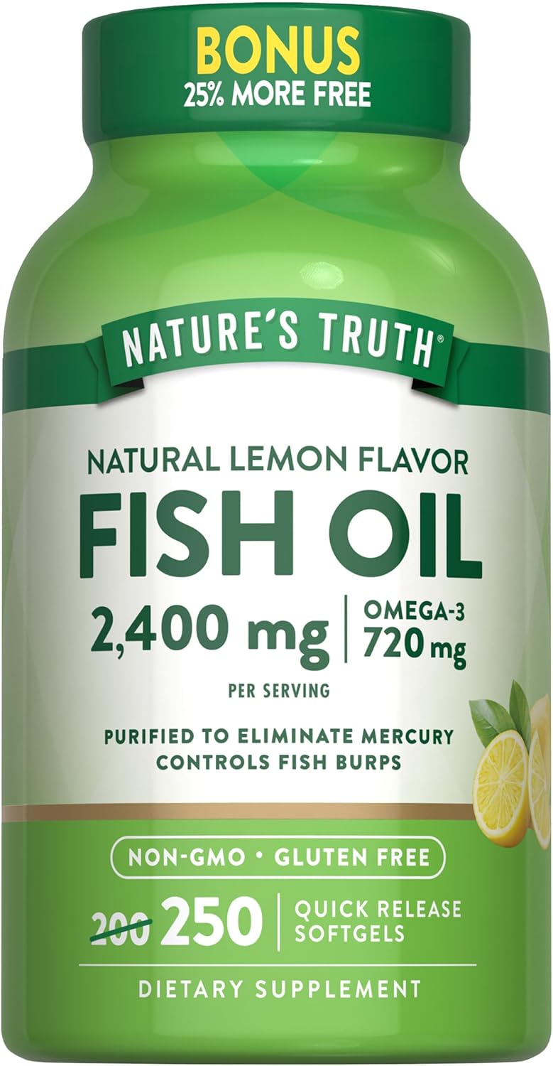 Nature’s Truth Burpless Fish Oil 2400mg یک مکمل باکیفیت حاوی روغن ماهی با دوز بالا است که برای حفظ سلامت قلب، مغز و مفاصل طراحی شده است. این محصول شامل 250 سافت ژل بوده و در هر دو عدد سافت ژل، 2400 میلیگرم روغن ماهی و 720 میلیگرم امگا 3 (شامل EPA و DHA) تأمین میکند.