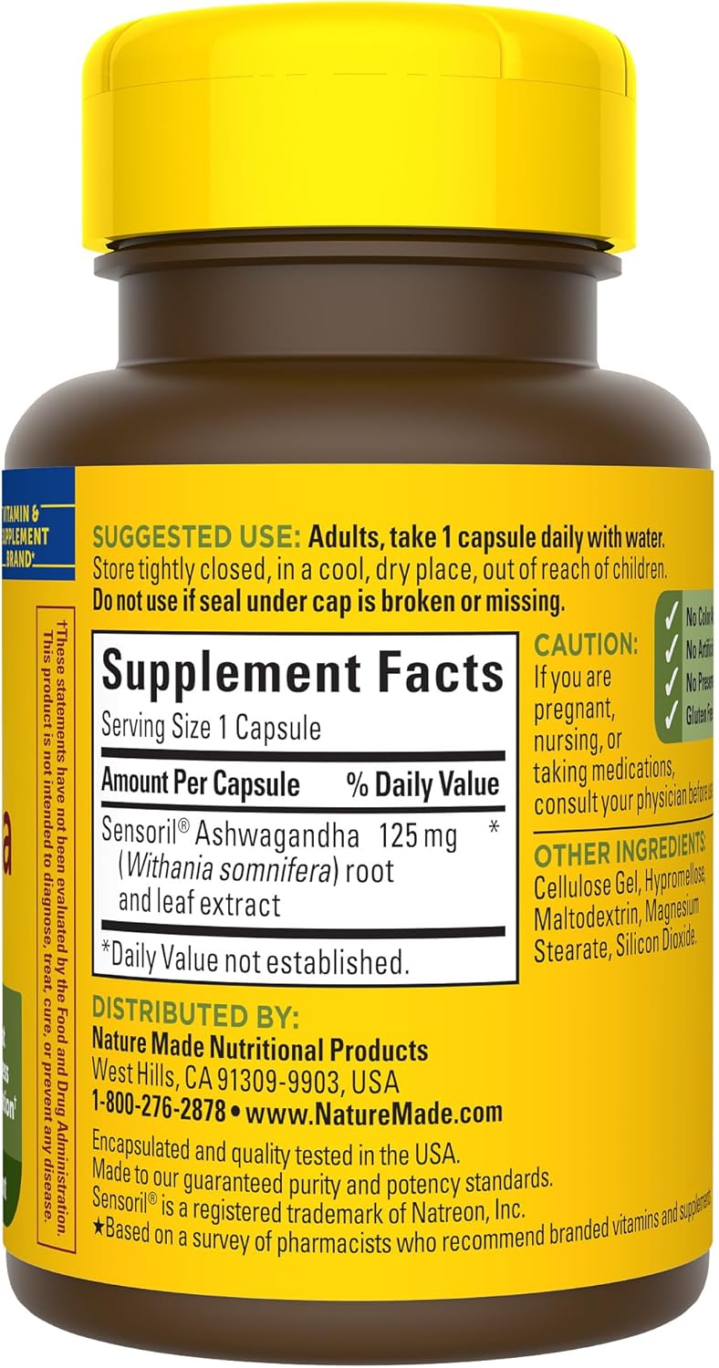 Nature Made Ashwagandha 125mg یک مکمل گیاهی قدرتمند برای کاهش استرس، بهبود کیفیت خواب و افزایش سطح انرژی طبیعی بدن است. آشواگاندا یک آداپتوژن طبیعی است که به بدن کمک میکند تا بهتر با استرسهای فیزیکی و ذهنی مقابله کند.