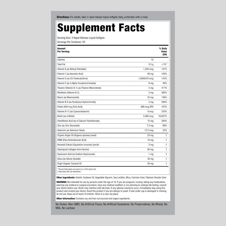 Piping Rock Hair Skin and Nails Vitamins یک مکمل تقویتی برای سلامت مو، پوست و ناخن است که حاوی ۵۰۰۰ میکروگرم بیوتین بهطور قوی است. این مکمل علاوه بر بیوتین، دارای روغن آرگان و روغن نارگیل نیز میباشد که خواص زیادی برای تغذیه و تقویت مو و پوست دارند.