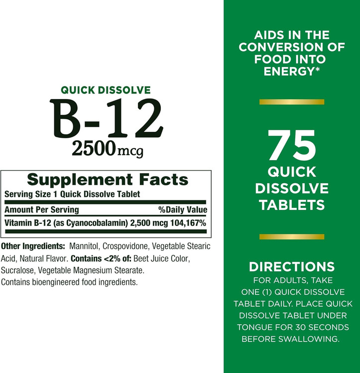 ویتامین B12 نیچرز بونتی ۲۵۰۰ میکروگرم – ۷۵ قرص حل‌شونده سریع
