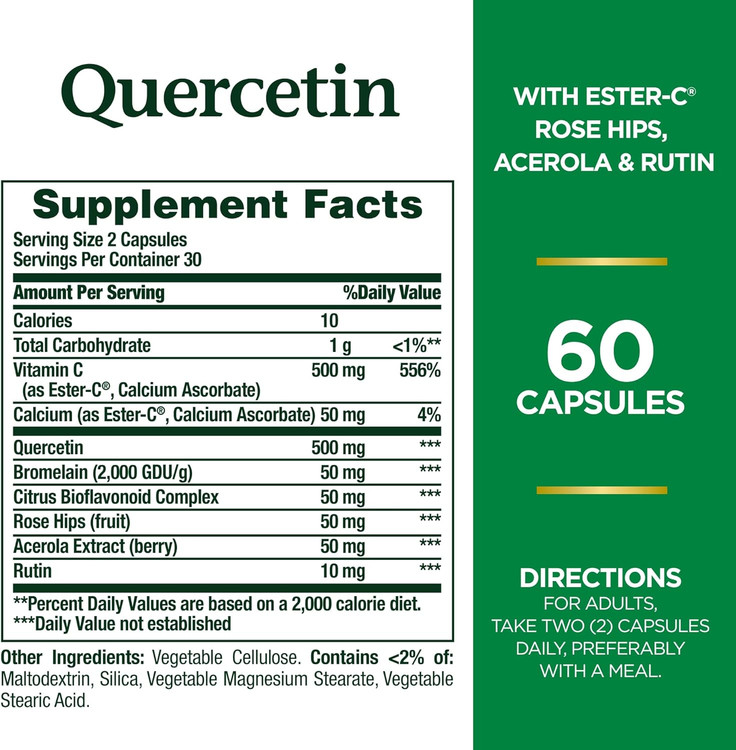 Nature’s Bounty Quercetin 500mg یک مکمل تقویتکننده سیستم ایمنی است که ترکیبی از کوئرستین، ویتامین C، عصاره گل رز هیپس و روتین را ارائه میدهد. کوئرستین به عنوان یک آنتیاکسیدان قوی، در کاهش التهاب، بهبود عملکرد سیستم ایمنی، و محافظت از بدن در برابر استرس اکسیداتیو نقش مهمی دارد.
