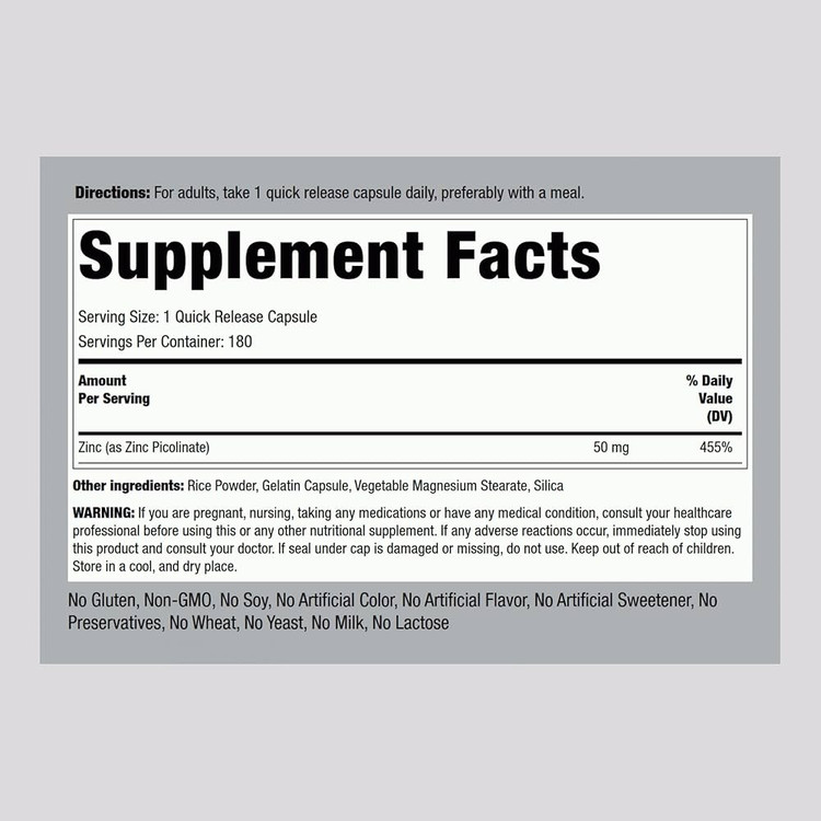 Piping Rock Zinc Picolinate 50mg | 180 Capsules | Non-GMO, Gluten Free Supplement
