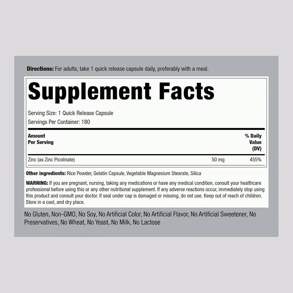 Piping Rock Zinc Picolinate 50mg | 180 Capsules | Non-GMO, Gluten Free Supplement